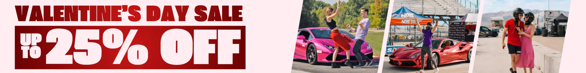 *Valentine’s Day Sale: Save up to 25% off select driving experiences through February 14. Discounts include 25% off Drive the Fleet, 20% off select packages and the Ferrari 296 GTB, and 15% off the Lamborghini Huracán, Ferrari 488 GTB, Porsche 911 GT3 (992), Porsche 718 Cayman GT4 RS, Corvette C8 Z06, and Nissan GT-R Premium. Discount applies to drives only (not ride-alongs), and is automatically applied at checkout. Cannot be combined with other coupons or discounts. Excludes merchandise, add-ons, and upgrades. Offer subject to change at any time.